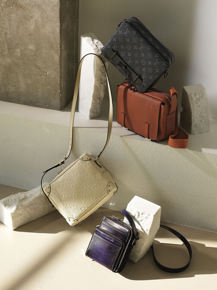 CLIPPED SQUARE 위부터_ 하드웨어 장식이 강인한 인상을 더하는 스티머 메신저 백 Louis Vuitton, 코냑 컬러 송아지 가죽 밀리터리 메신저 백 Loewe, GG 모노그램을 양각으로 표현한 화이트 가죽 숄더백 Gucci, 보랏빛이 감도는 블루 베네치아 양가죽 소재 마일스 메신저 백 Berluti. BIGGER IS GREATER 위부터_ 베이지 컬러 송아지 가죽 안티고나 소프트 쇼퍼백 Givenchy, 로고 패턴의 라피아 소재 쇼퍼 백 Fendi Men, 3색 리본 패턴과 마카롱 로고 장식으로 포인트를 준 캔버스 소재 오! 쇼퍼 백 Moynat.