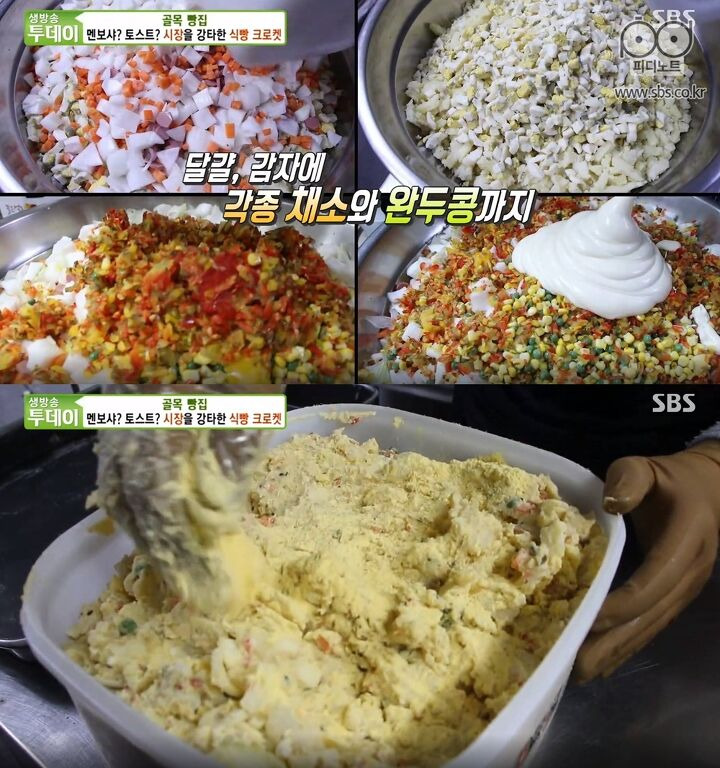 여기까지는 일반 토스트나 샌드위치 속을 만드는 것과 비슷해 보이는데요 식빵 위에 속을 듬뿍 넣고 비법 반죽과 빵가루를 듬뿍 묻혀 바삭바삭하게 튀겨내면!! 부드럽고 고소한 식빵 크로켓 완성!!