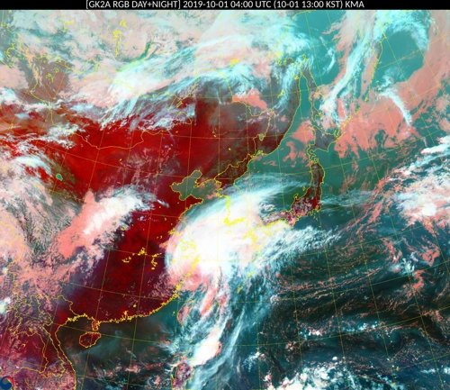 [기상청 제공](서울=연합뉴스) 김승욱 기자 = 제18호 태풍 '미탁'이 북상하면서 1일 오후 남부지방을 중심으로 점차 태풍 영향권에 들고 있다.