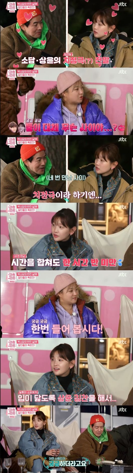 27일 방송된 JTBC 예능 '갬성캠핑'에서 이상윤과 박소담이 핑크빛을 해명했다. 오늘의 게스트로 배우 이상윤이 등장, 그는 소담과 친하다고 설레발을 쳤다면서 애칭으로 '미스터 설레발씨' 이름을 얻어 웃음을 안겼다.