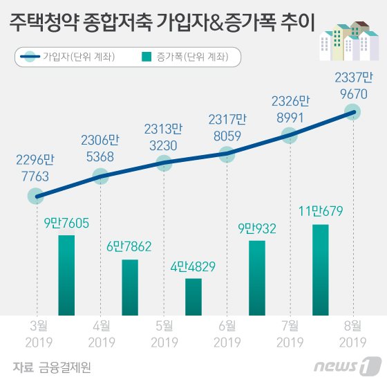 18일 금융결제원 청약통장 가입현황에 따르면 올해 8월 말 기준 주택청약 종합저축 가입자 수는 2337만9670명으로 집계됐다. 이는 7월 2326만8991명보다 11만679명이 늘어난 수치다. 지난 3월(13만2016명) 이후 5개월 만에 신규 가입자 수는 10만명을 다시 넘어섰다.