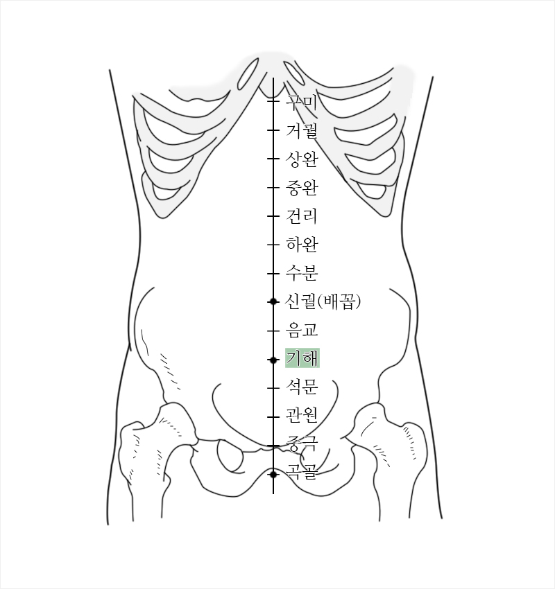 기해(氣海)혈은 기의 바다라는 뜻이다. 그래서 남자의 단전(丹田)이 관원(關元)혈이라면, 감정(氣)이 풍부한 여자의 단전은 기해혈이다. 단전혈에 항상 뜸을 뜨면 치매를 예방할 수 있는데, 기해혈은 분노 곧 화(火)냄도 억제할 수 있다. 유공도는 남자의 정(精)보다는 성냄을 더 주의한 것 같은데, 남자 여자 가리지 않고 치매와 중풍에 걸리지 않으려면 기해혈에 뜸을 뜨는 것이 좋다. 몸의 정 가운데 선에서 배꼽(신궐혈)과 불두덩 뼈 상단(곡골혈)까지를 5등분 하였을 때, 배꼽에서 1.5등분 아래가 기해혈이고 3등분 아래는 관원혈이다.