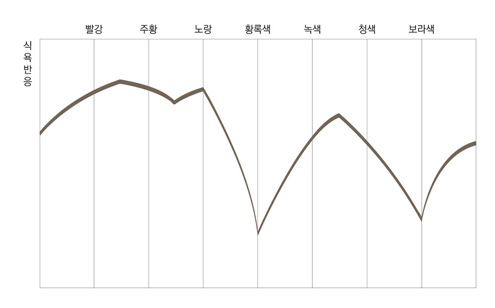 색에 따른 식욕 반응 스펙트럼. <출처: 노무라 준이치, [색의 비밀]>
