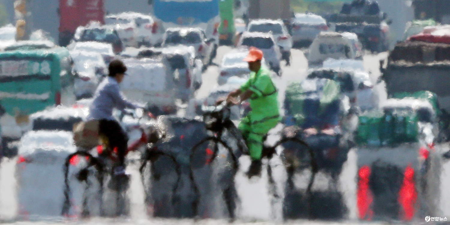 폭염으로 뜨거워진 도로 위의 열기가 시야를 가리고 있다. <출처 : 연합뉴스>