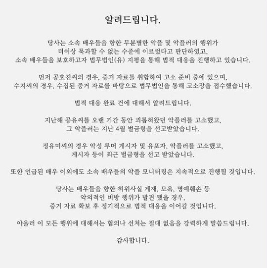 또한 언급된 배우 이외에도 소속 배우들의 악플 모니터링은 지속적으로 진행될 것입니다.