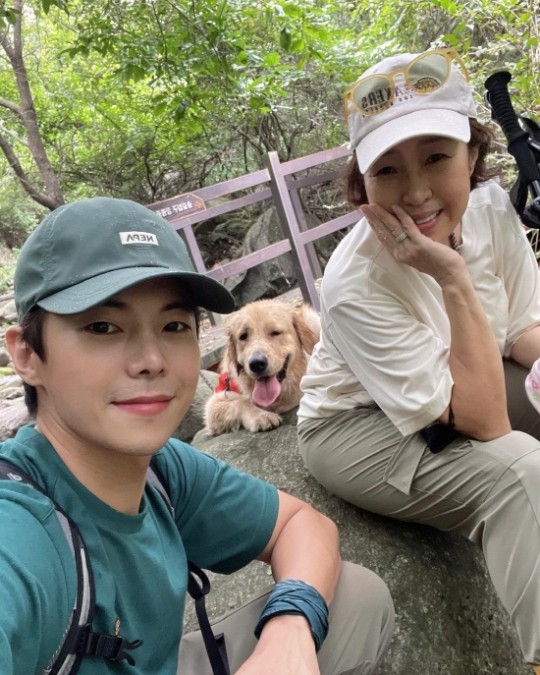 사진 속 박은석은 어머니, 그리고 반려견 몰리와 등산을 하며 포즈를 취하고 있다.