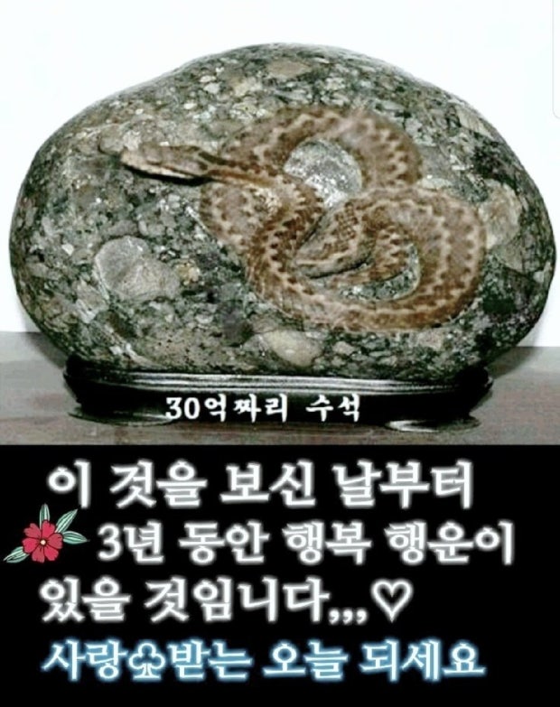 추분(秋分)맞이 행운의 30억짜리 수석 보고 가세요! 꽃편지 꽃님들! 오늘 추분을 맞이하여 올 가을엔 계절이 주는 풍요로움으로 행운만 가득하시길 바랍니다! 그래서 오늘은 행운을 가져다주는 30억짜리 수석을 소개해 드리려합니다! 표면에 뱀이 거의 원상태 그대로 화석으로 남아 있어서 매우 희귀해 행운을 가져다준다고 합니다. 지인분들과 함께 나누면 나눌수록 행운이 커진다고 합니다. 귀하고 희귀한 수석 감상하시고 행운, 건강, 재물, 행복, 웃음 모두~ 부자 되시길 기원합니다. 멋지고 귀한 수석도 구경 하셨으니 행운이 함께 할 겁니다^^ ★ 뽀너스! 행운선물!!! ★ 다양한 희귀한 수석들도 함께 보고가세요!